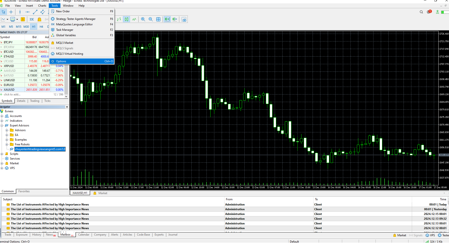 - Trên MetaTrader 5, vào menu Tools > Options.