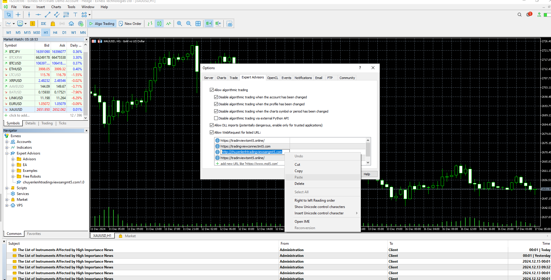 Để EA có thể nhận lệnh từ server, bạn cần bật tính năng WebRequest trong MT5: